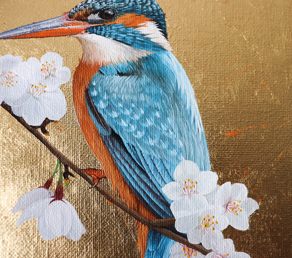 KINGFISHER est un tableau représentant un martin pêcheur sur une branche de fleur de cerisier. Le fond est réalisé à la feuille d'or d'imitation, ce qui lui apporte une brillance selon la luminosité.